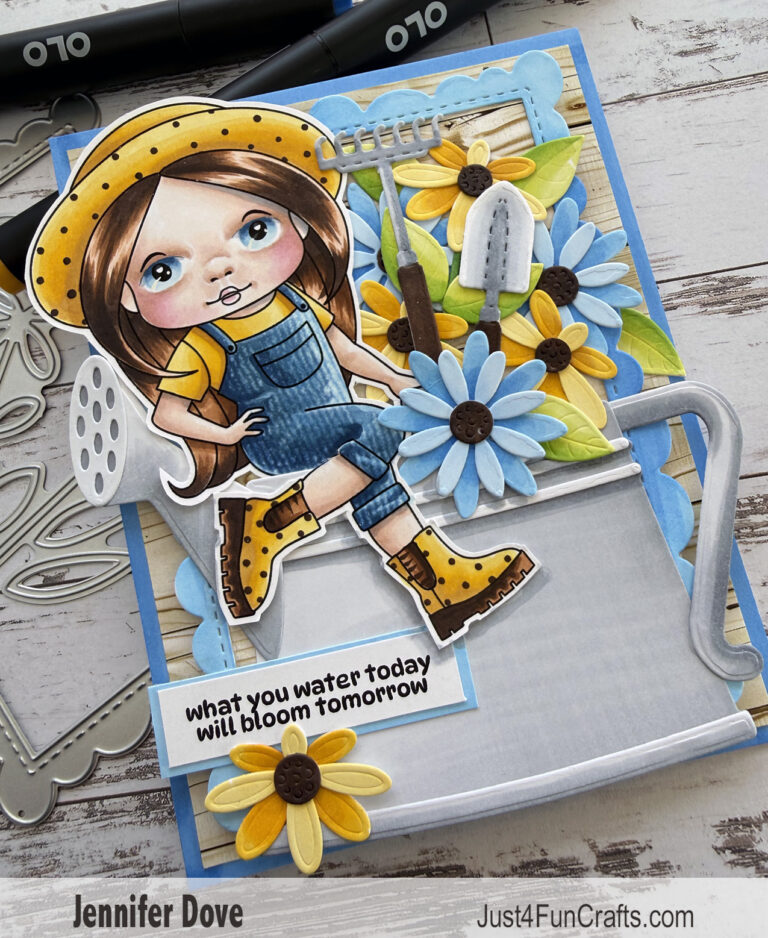 Spring is in the air....well maybe getting close. This Marci, sitting on her watering can, is already picking flowers out of the garden. I love the color combo of blues and yellow, so thought I would make her match her garden flowers. Check out the cute gardening tools I added into the flower arrangement. This image and watering can is...Read More