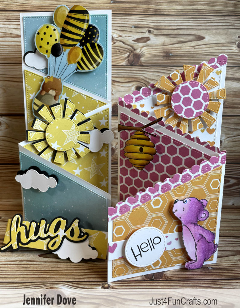 This is the “normal” #6 Concertina card layout. I thought I would create it using the pinks and yellows from Bizzy Bees 6×6 paper packet, and the same paper packet was also used for the other card below as well. The cute bear I colored is from Hello Bear clear stamp set, and the set comes with a sweet little hive too. Using my favorite scallop die from Kinetic Straight basics set, I added the pink edging to the zig zag fold, and the sunshine from Up in the Clouds dies was placed on the upper portion to bring all the colors together. I chose to not decorate the inside of this card so that there would be a surface to write on. This set comes with all the dies needed for decorating inside and out, and it also gives the option for the side you can have it open from.
