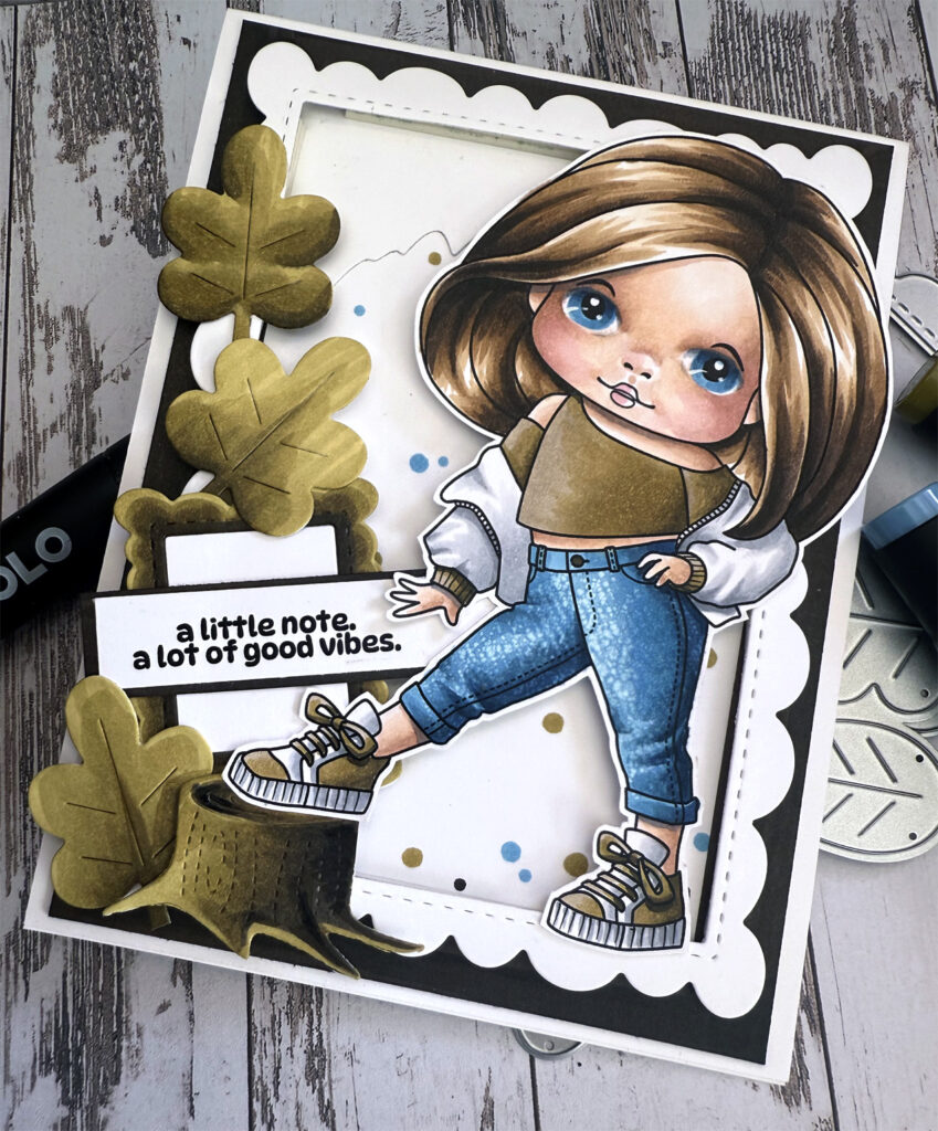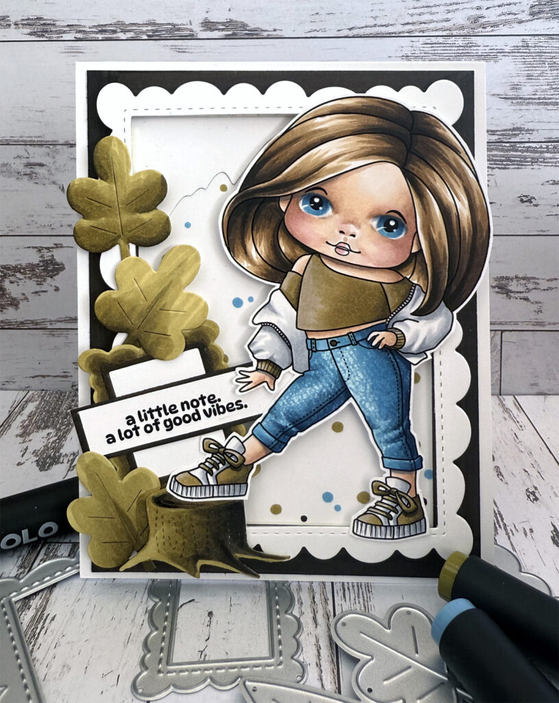 Marci is enjoying a fun day out in nature. A cute pose and a quick selfie. I kept the detail focused on her and not the elements on the card. The fun Scalloped Frame gives the card a little texture and is appeasing to the eye.