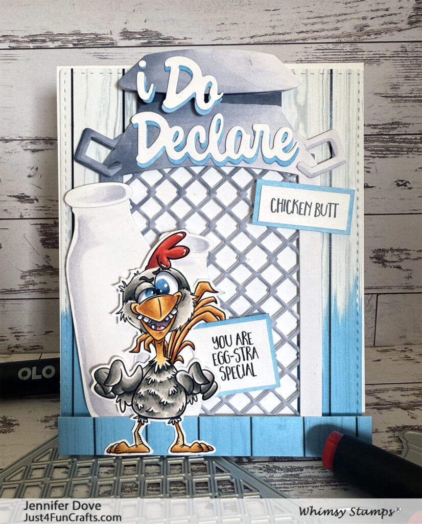 I combined this new rooster with some of the fun barnyard things you might already have. A milk can and a chicken coop. A must for those card makers. A super fun card that will totally bring out some smiles! I hope you take inspiration from my cards, and even borrow the design to make your own. You have permission!