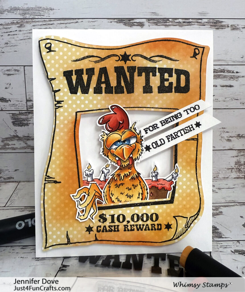 If you have already checked out the Whimsy Stamps release you are probably thinking how I was gonna use the “Wanted Poster” stamp with the roosters. I can hardly stand it…just look at that face! You know he is wanted for something. For this card he is wanted for being too old fartish. If you don’t giggle a little you need to go back to bed and get back up on the other side. JUST SO FUNNY!