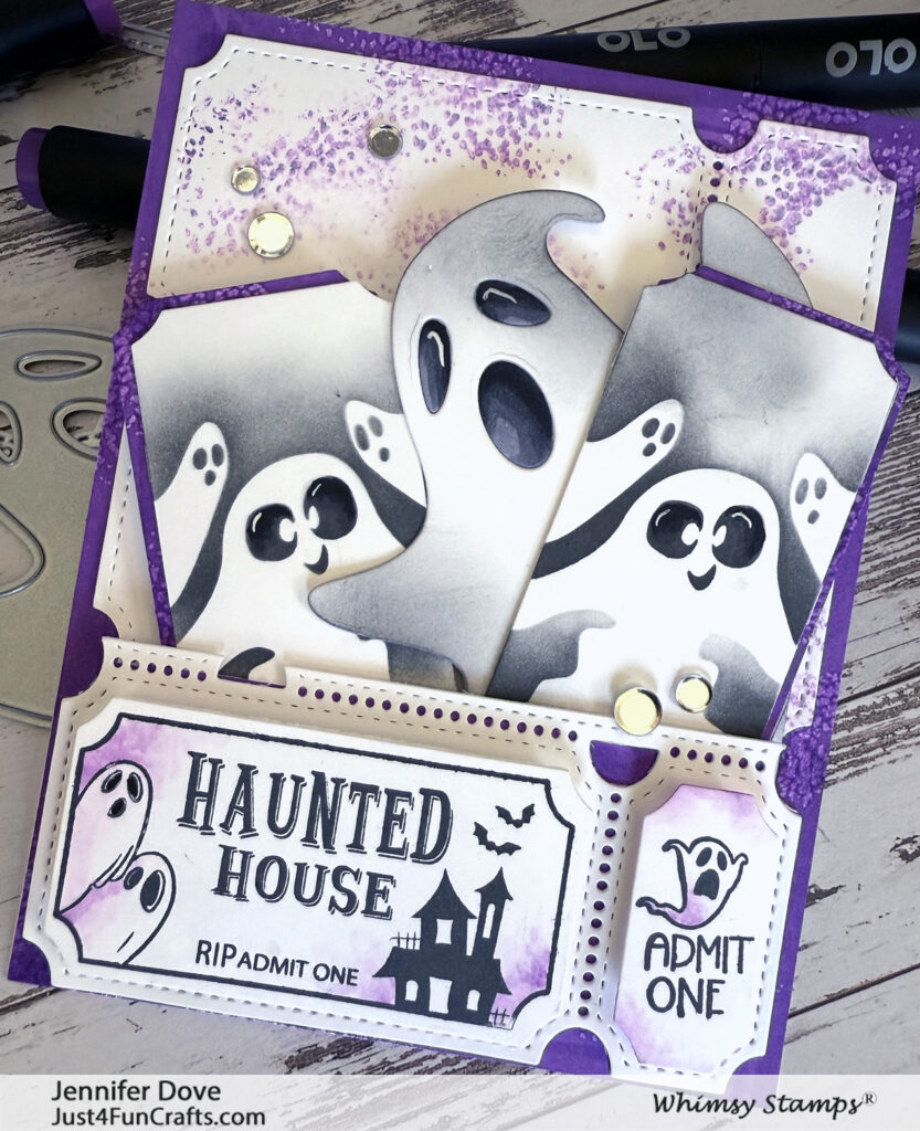 The coloring was simple. I colored the ticket mat, and added a few purple shadows to the ghosts to keep the color going throughout the card. The texture on the tickets was created by adding ink to acetate and then picking it up with a little alcohol on a piece of wash cloth…then dabbing it on the paper. Gave it a nice cohesive look, and was fun to do.