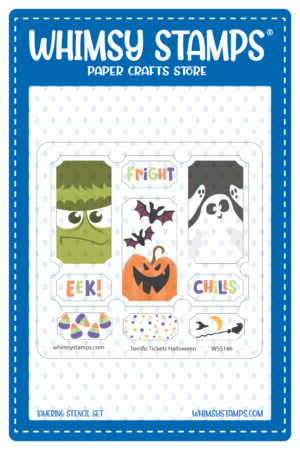 That’s the ticket! How about some cute ghosts for the Halloween season. The combo of all the NEW ticket products makes for a cute card. For this card I did a little stencil inking to create two ghost panels, and then combined it with a larger ghost die. Everything was layered on the different ticket dies.
