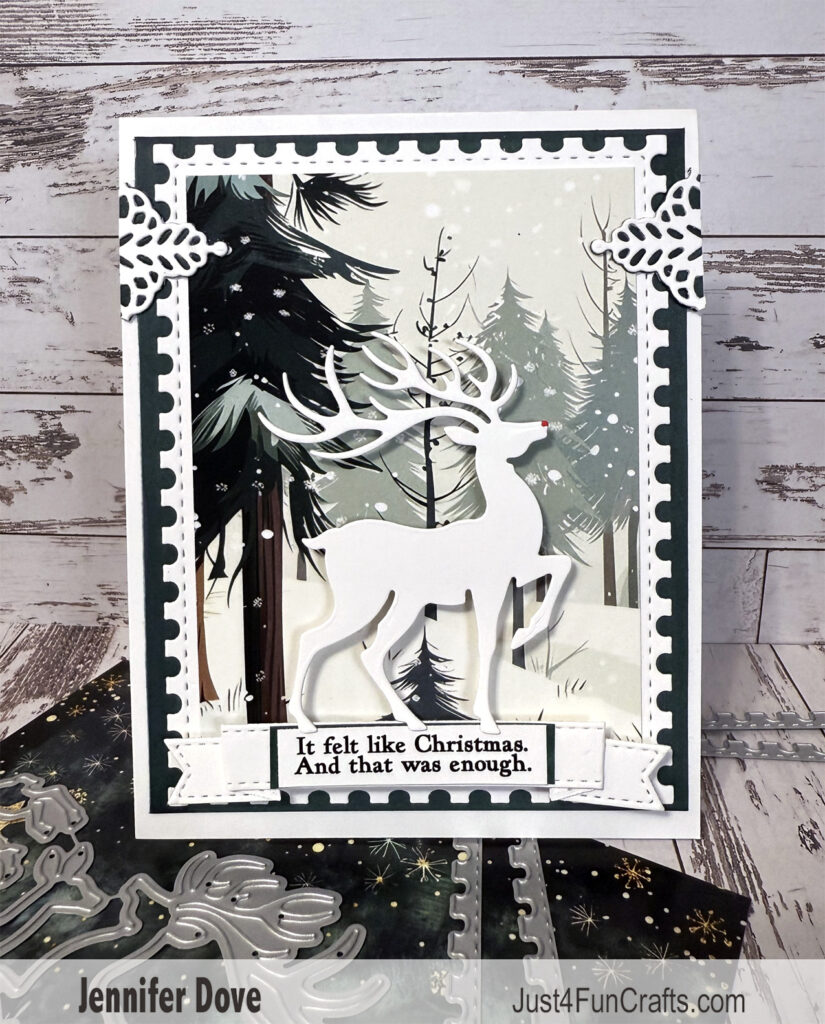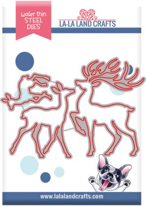 What a fun card created with ONLY paper and dies. A wintery feel for the Christmas holiday. These goodies are from the Christmas release over at La-La Land Crafts. If this doesn’t get you into the holiday spirit, nothing will. A fun way to create stress free with no coloring (except the little red dot on the deers nose). Just die cut and layer! Links below.