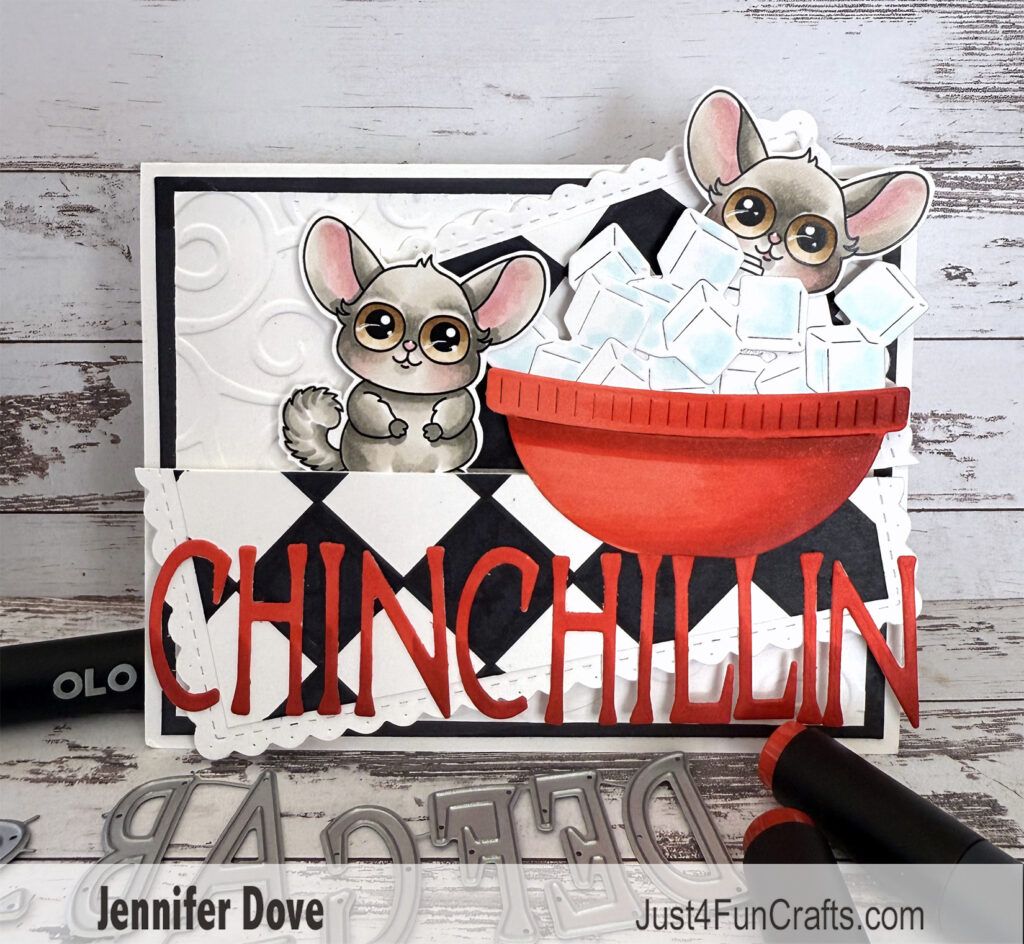 For this card I added the chinchillas to the lid from the coffee/boba Teas cup die to create a bowl of ice. Chin-chillin’. A fun way to present the KOTM release with a little “out of the box” creativity.