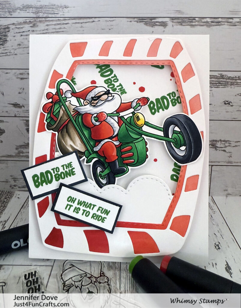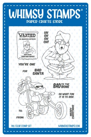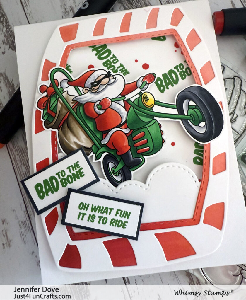 You all had it wrong. THIS is Santa’s real sleigh! Brap Brap! Hope he has some silencers on those mufflers! A perfect dude card or for a chick with the need for speed. I love that Whimsy Stamps has stamps and products you don’t see any other place. Another fun way to welcome in Christmas.