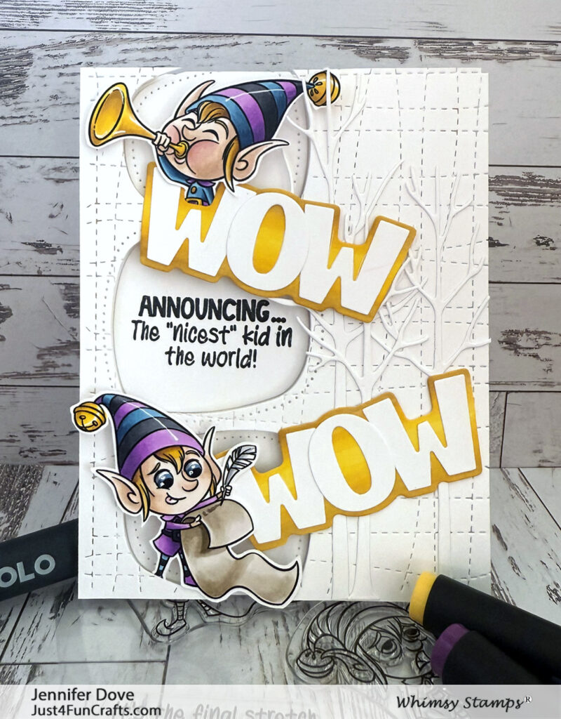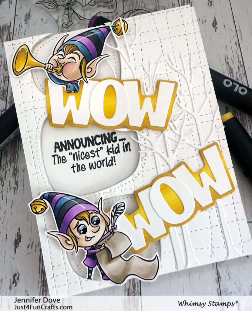 As you know I love white cards with texture. Here is a cool one with a bold WOW, WOW! These elves are here to welcome in the “nicest kid in the world”. Get those cards whipped up for all the grandkids. Toot! Toot! Toot!