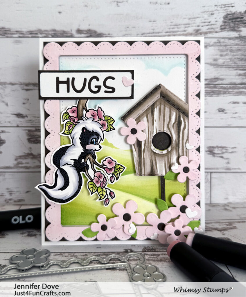 Here is a “fresh” look at these odor-able sweet skunks. She is hanging out in the garden, sending hugs your way. For this card I created the backdrop with my markers, and added some flowers and a birdhouse. A very cutesy card for that special person…stinky or not.