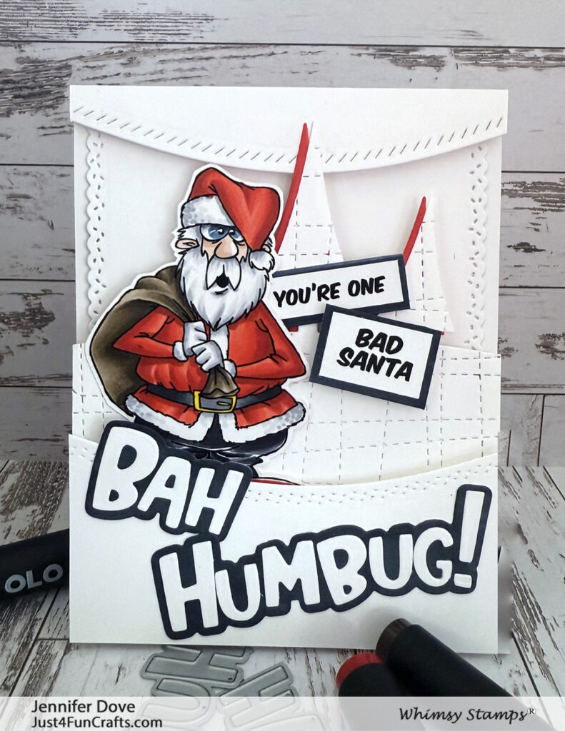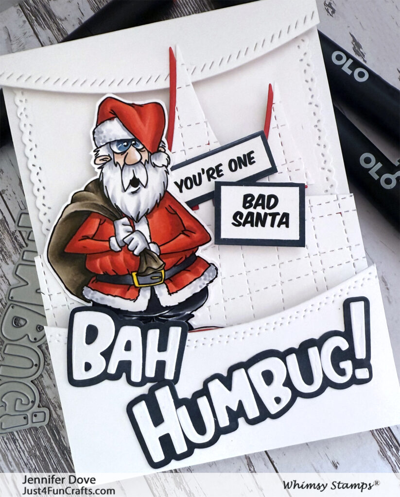 Just one more BAD card from this release. White on white with color-pop, and a little bad attitude. Even Santa can be “over it”. I played a lot with the textures on this card, utilizing dies and layering. It really brings more interest to a card don’t you think?