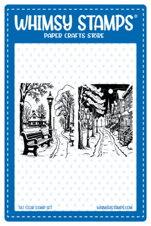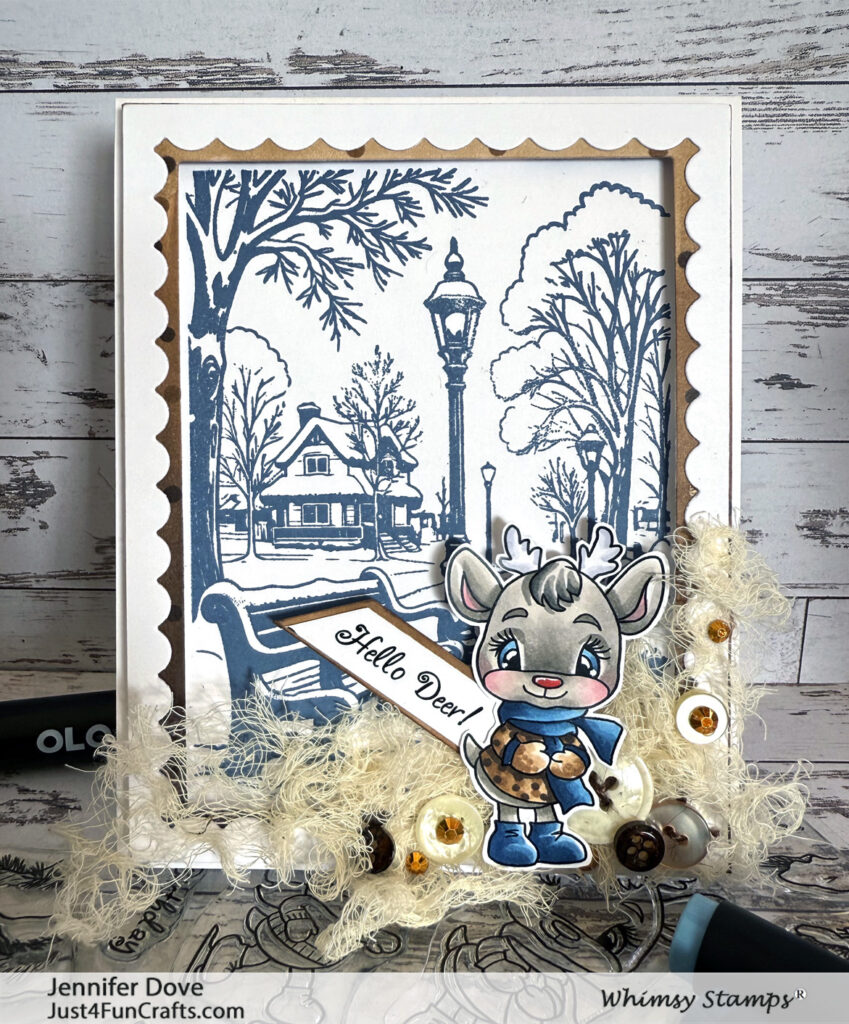 Have you seen the latest WhimsyStamps release? It is a must for those Christmas card plans you have. This card was simple as there wasn’t much coloring involved. The card is just a die and stamping. I think it matches the image style perfectly.