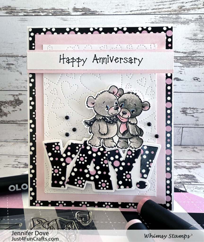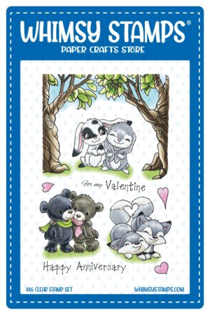 I am really in love with this paper packet. There are so many fun patterns to choose from. I kept this card simple, and allowed the paper to stand out with this new adorable image from Whimsy Stamps. You must check out the three cute couples. The background was “die cut” using the Floating Hearts Cover Plate, which gives a nice texture to the card.