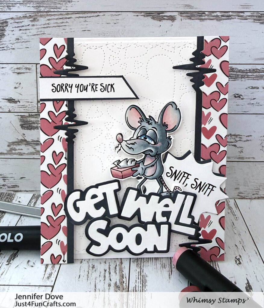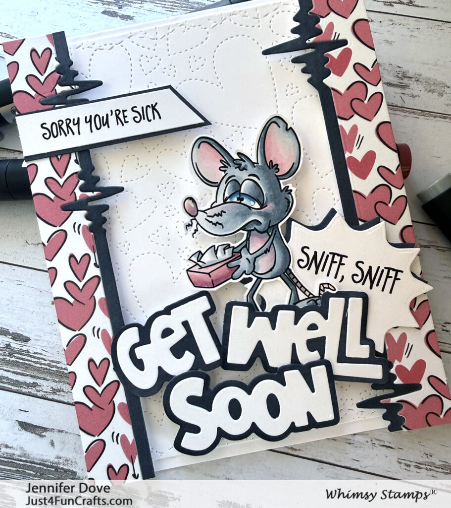 AAAAACHOOO! ‘Tis the season! Better stock up on “get well cards”, and get ready for distant hugs. I thought I would pull out the cute Rat’s You’re Sick stamp set and create a cute card. I used all things hearts for this layout. I love the look of the heartbeats as a divider between the pattern paper and the background. Something a little different, and adds a nice border. The accent of the black against the white worked well for the sentiments too. I hope you like today’s inspiration.