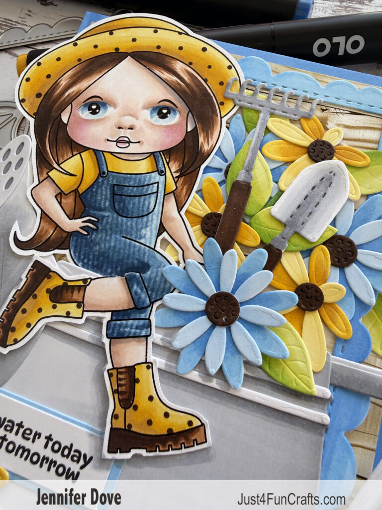 Spring is in the air….well maybe getting close. This Marci, sitting on her watering can, is already picking flowers out of the garden. I love the color combo of blues and yellow, so thought I would make her match her garden flowers. Check out the cute gardening tools I added into the flower arrangement.