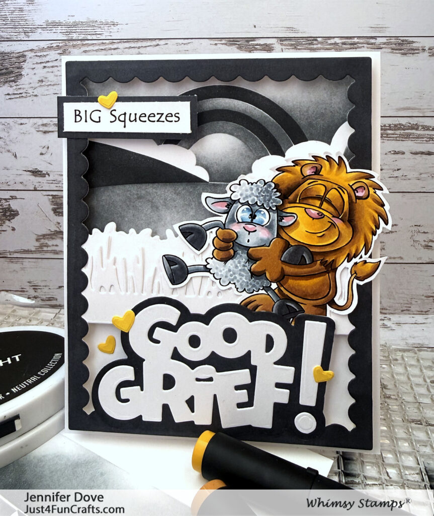 For this card I stenciled the background with the new Rainbow Landscape Layering stencil. I decided to use two stamp pads, a gray and a black, to keep it subtle. I added layers of grass, a cool sentiment die and a cute image. I love this stamp set from Whimsy Stamp from Dustin Pike collection. It is called Friend like Ewe. This was super fun to create. I hope you are inspired!