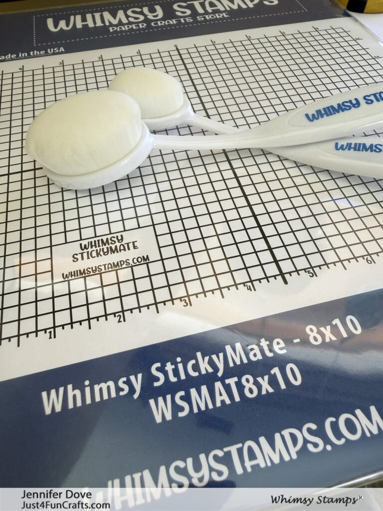 Introducing Whimsy Stamps 8 x 10 StickyMate tool. I got to play a bit the other day. This thing is cool. You peel off the thinner clear protective sheet on one side if you want to stick it to a class surface. If you don’t care if it’s stationary you can leave this backing in place. Next you will peel off the printed thicker protective sheet. This is the side you will lay your paper you are going to stencil onto, then placing the stencil over top. The stencil sticks down so nicely.