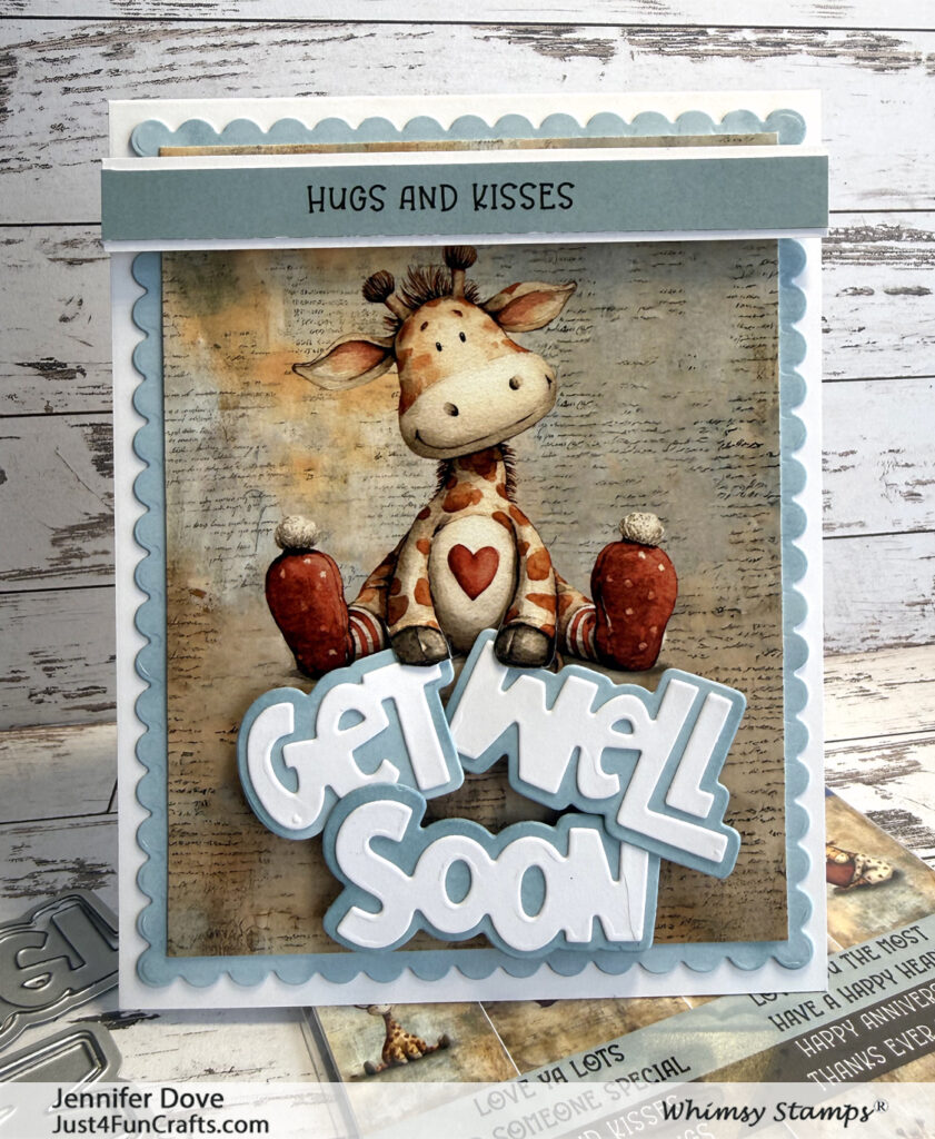 O-M-G! Cuteness overload! I love the Quick Card Front card option. They are not only beautiful, on quality paper, but allow for a quick and easy card. I fell in love with these QCF packets. The giraffe faces and poses are so adorable. All I did for this card was add frilly border, and a fun die cut sentiment. If you are always in need of a quick card for occasions that sneak up on you be sure and check out all the Quick Card Fronts over on the Whimsy Stamps website. Sometimes you just don’t have time to color…and that is okay!