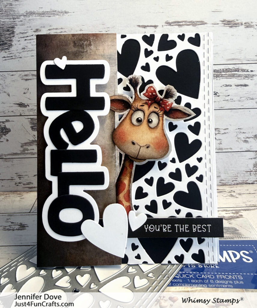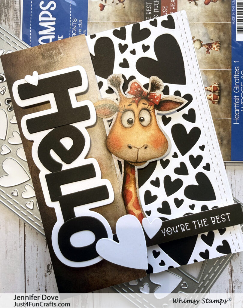 Heart be still! A card front paper packet that is so adorable. I didn’t even color a single thing. Quick and simple! With two card front paper packs to choose from, you can’t go wrong. I cut out half of the card front and did a peeking giraffe. Simply add a background die-cut to one side, and a great die-cut sentiment to the other side, and the card is complete.