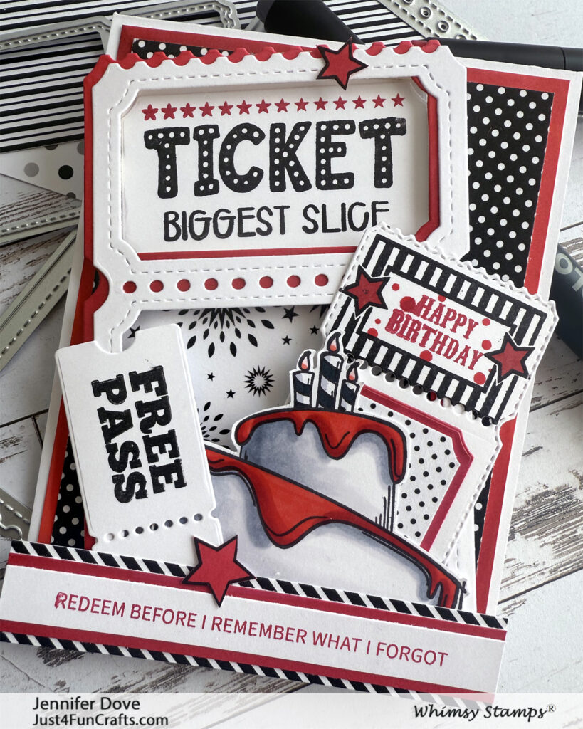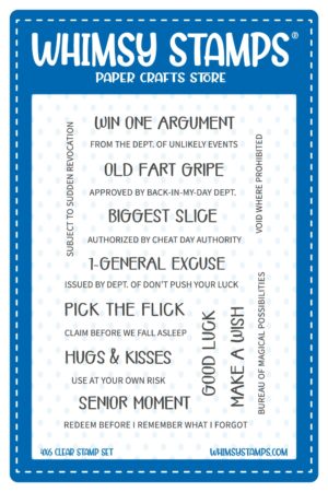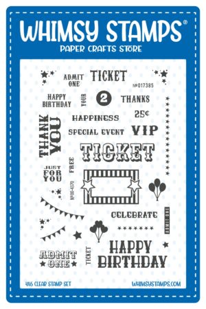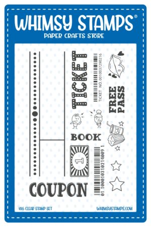 I used all the items shown below for this card. The great thing is they can work together or separate to create your own cool card. I just love it when Whimsy Stamps releases new cool stuff! Be sure to check out all the awesome sentiments in the Ticket Coupons Sentiments clear stamps.