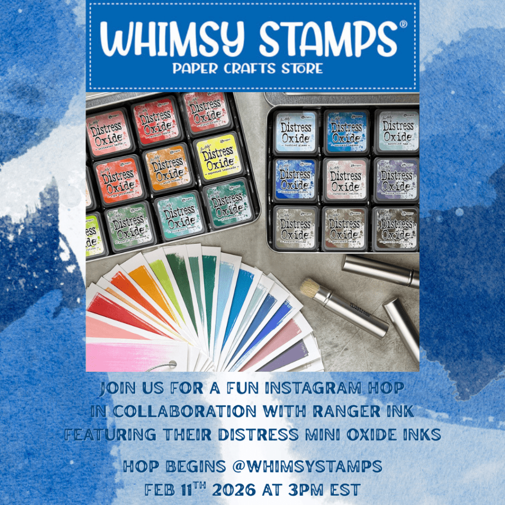 Welcome to our first Whimsy Stamps Instagram Hop of 2026. We have the wonderful Ranger Ink collaborating with us for this hop and they have generously provided our team with some fabulous Mini Oxide Ink Sets to have a play with and create with. So you will see lots of inspiration with these amazing inks in the hop and we’re sure you’ll be as inspired to try these as we have been!