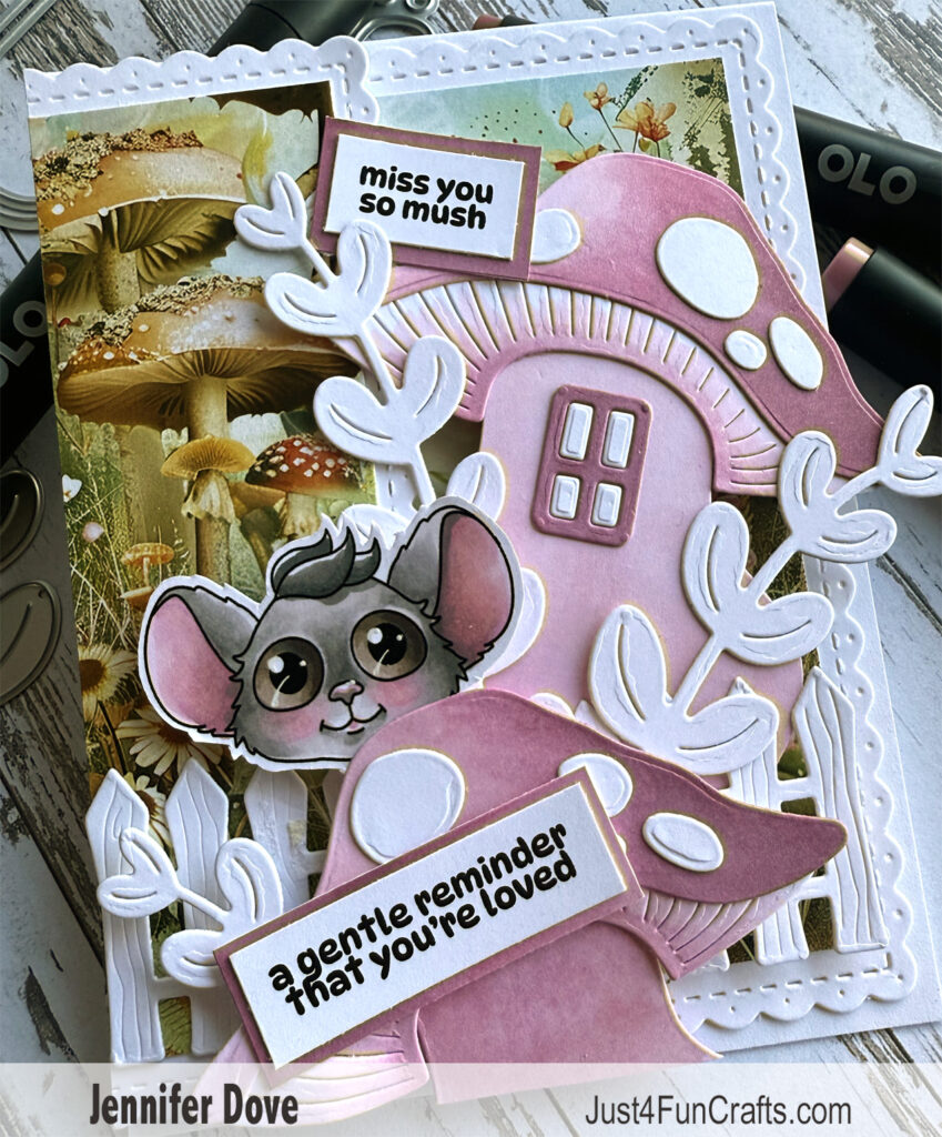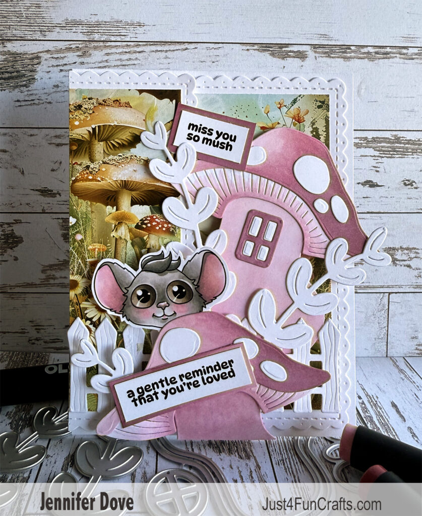 Okay, I have to admit that I recolored the mouse before creating the card. Once the card was done I grabbed the colored image and realized it didn’t match in the slightest bit. My solution was to tuck him behind the mushroom. It worked…and no one would have known the different until now. Now you know!