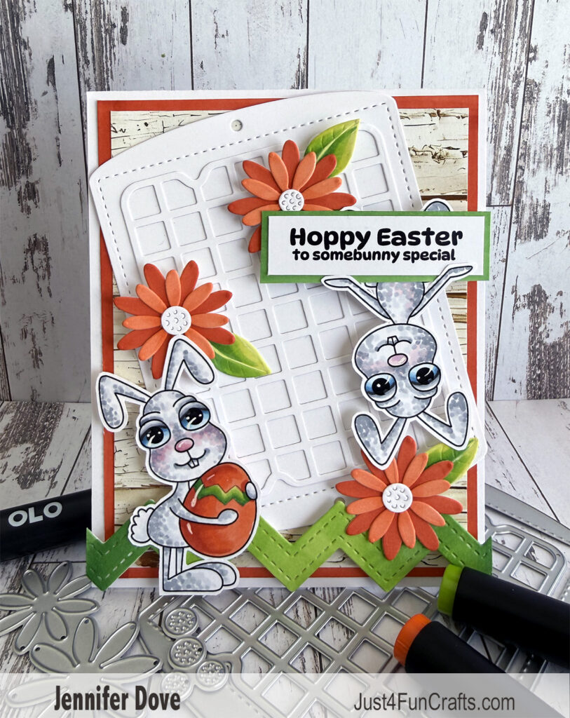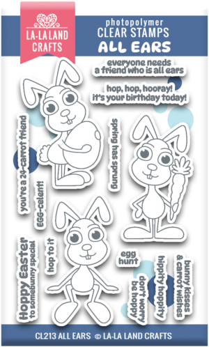 Hopping into Spring with these funny-bunnies doing cute things. The look and feel of this card makes me all sorts of happy! It just all worked! The bunnies are a new La-La Land Crafts release, and there is so many great choices to choose from. To make it easier to shop I always provide the links below.