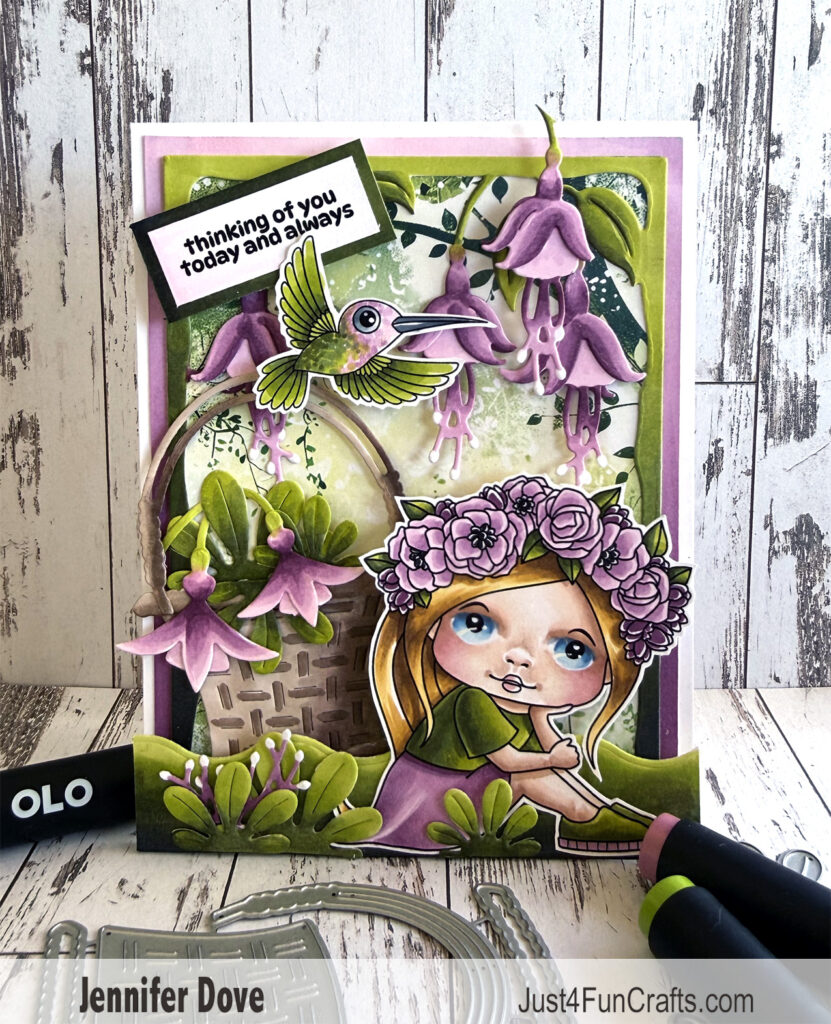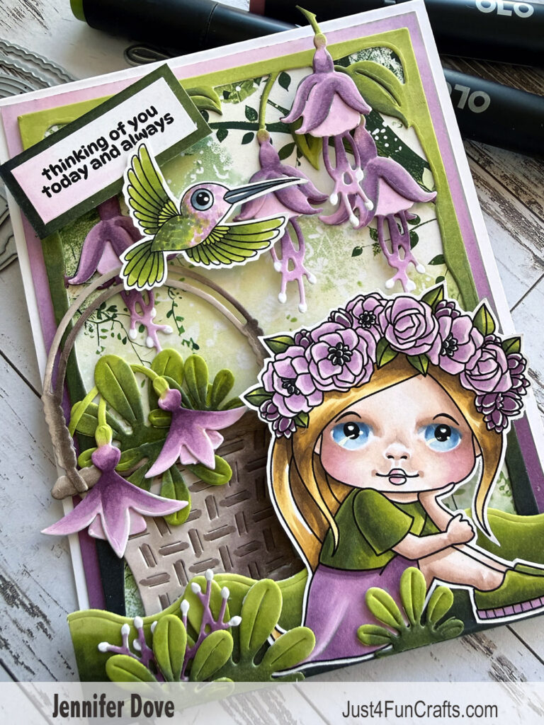 I felt like I was in a dream while creating this card. Sweet Marci and her hummingbird, in a garden of bliss. What a FABULOUS Kit of the Month from La La Land Crafts. If you ever considered subscribing, NOW is the time. You can also purchase without a subscription, but the exceptional saving is worth the subscription…plus after a month you can purchase past kits.