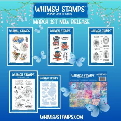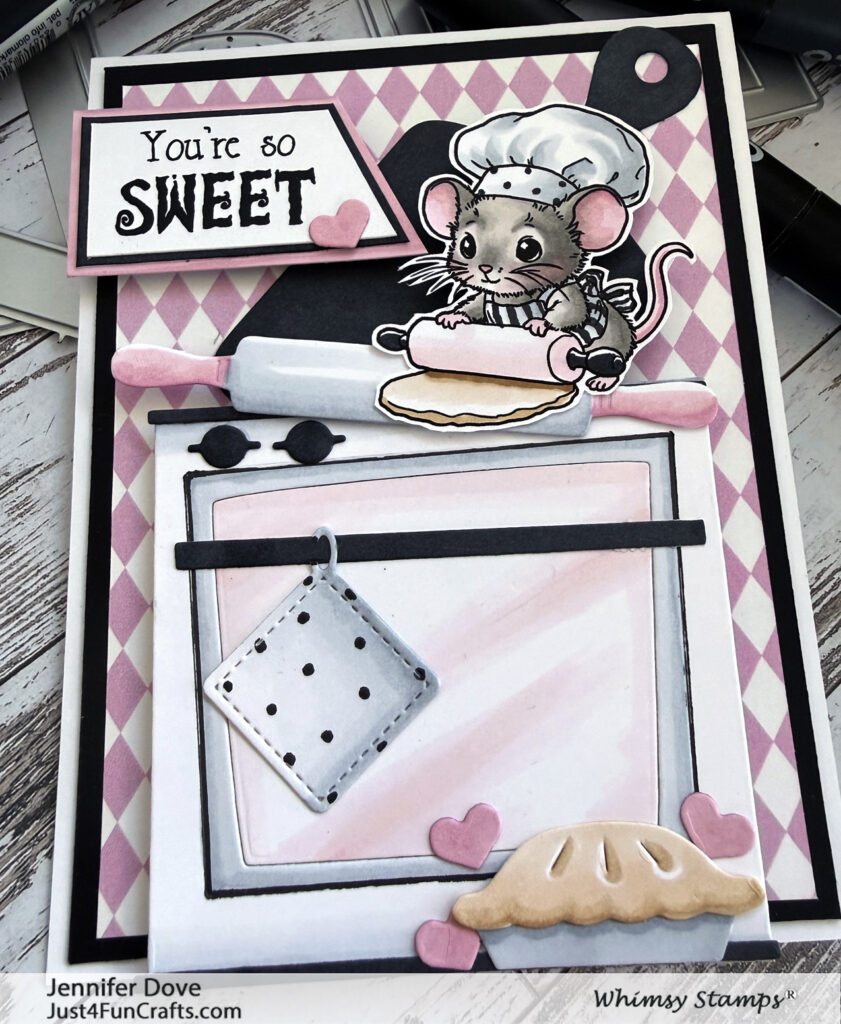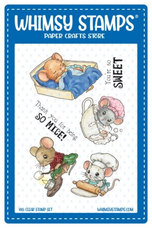 There is nothing quite like waking up to something fresh out of the oven. The wonderful smell that fills the air with a bit of homemade baking is just divine. How about waking up to a great new Whimsy Stamps release…I think that is divine too. Introducing this sweet mousey stamp set. I loved this set so much, and created a little scene for the happy baker to sit upon.