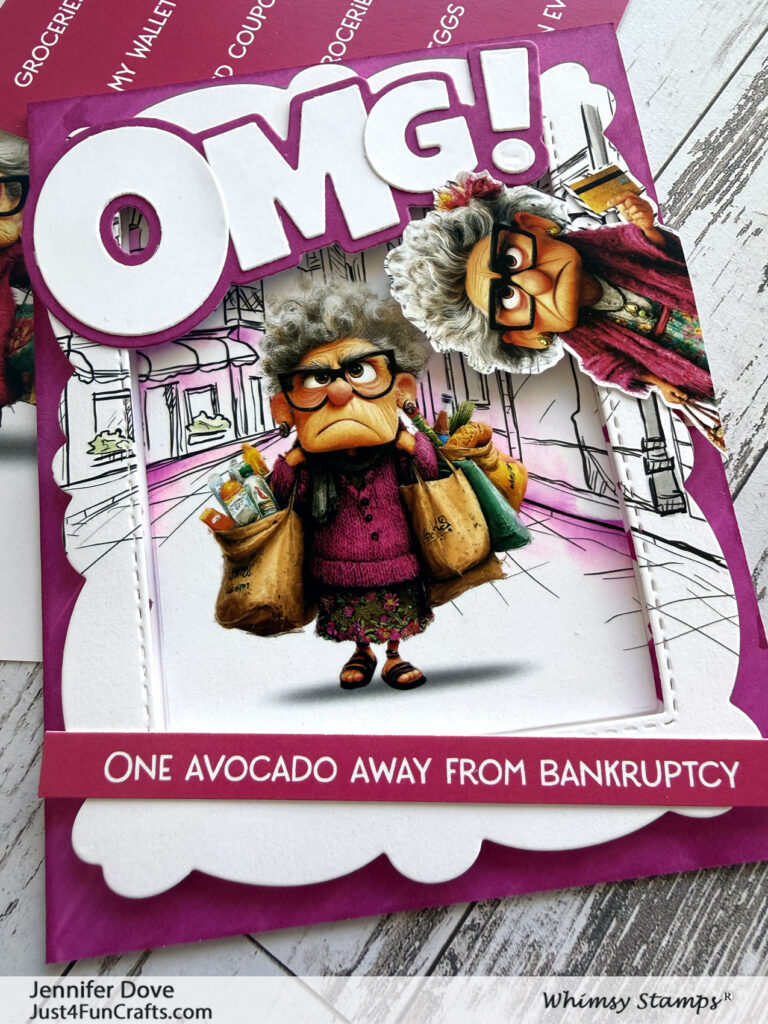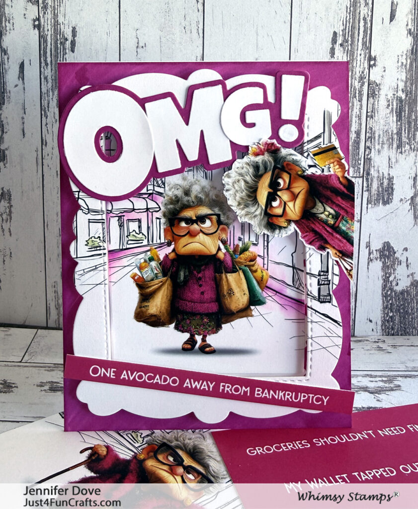 Say it isn’t so! Card fronts…no coloring needed! This set of A2 card fronts just had me in stitches. The grumpy ladies just stole my heart. For this paper packet I think they have it in the bag (shopping bag) with their expressions. Perfect for those quick cards when needed. I did add a little color using my alcohol markers into the scenery to make it match the color theme. I hand cut out one of the ladies to peek off the edge of the NEW die cut. This A2 paper pack has me in stitches with the expressions and the sentiments. When life is tough, don’t forget to laugh a bit.